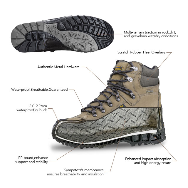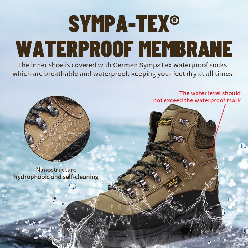 Sepatu bagian dalam dilapisi dengan kaus kaki tahan air German Sympatex yang dapat bernapas dan tahan air, menjaga kaki Anda tetap kering setiap saat.