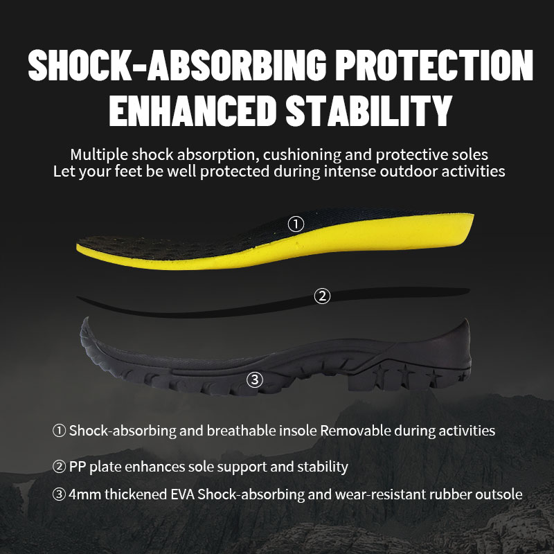 ①Sol dalam yang empuk dan menyerap keringat—dapat dilepas saat Anda perlu membersihkan atau menggantinya. ②Diperkuat dengan pelat PP untuk dukungan ekstra pada bagian bawah kaki—sehingga setiap langkah terasa kokoh dan terkendali. ③ Sol luar karet EVA tebal yang menyerap guncangan dan tahan aus ③4mm.