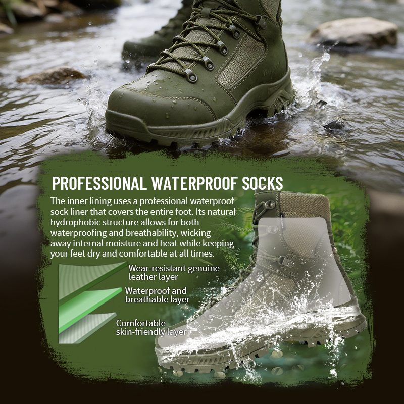 Lapisan dalam menggunakan kaus kaki tahan air profesional yang menutupi seluruh kaki. Struktur hidrofobik alaminya mencegah masuknya air sekaligus membiarkan panas dan keringat keluar—sehingga kaki Anda tetap kering dan nyaman.