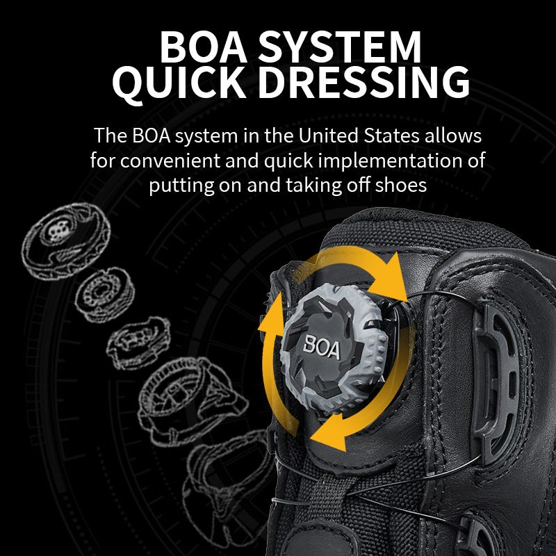 Sistem BOA membuat on/off menjadi mudah: putaran cepat untuk mengencangkan, tarikan untuk melepaskan. Tanpa tali, tanpa kerumitan.