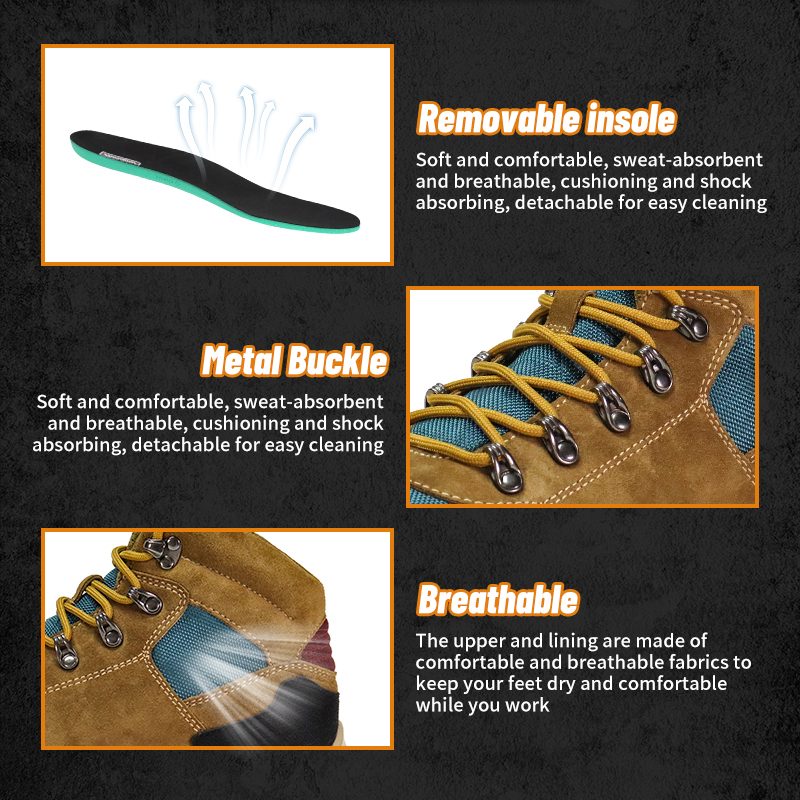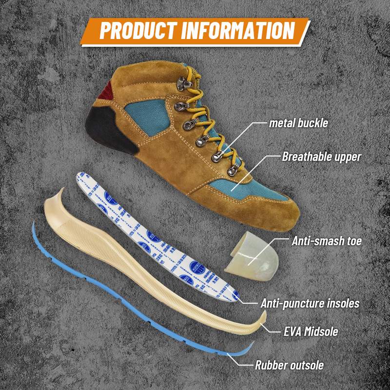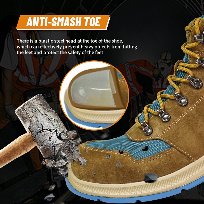 Terdapat kepala baja plastik di ujung sepatu, yang secara efektif dapat mencegah benda berat mengenai kaki dan melindungi keselamatan kaki.